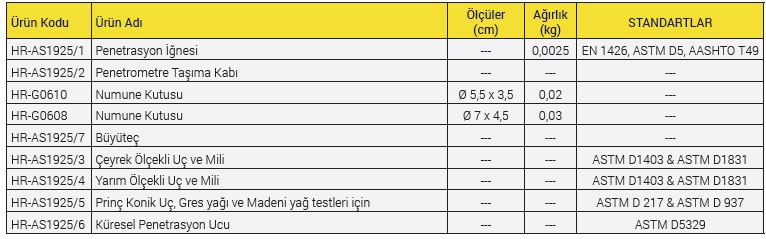 Bitüm Penetrometresi; kaba ve ince yükseklik ayar özellikli taşıma kolu, dijital iğne batma derinliği göstergesi, Otomatik penetrasyon (batma zamanı ayarlama) zamanlama ünitesi, standartlara uygun penetrasyon iğnesi, taşıma kabı ve 6 adet Ø 55x35 mm Numune Kutusu ile birlikte verilmektedir.