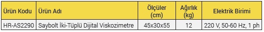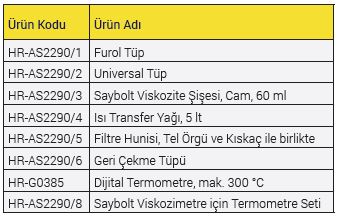 Paslanmaz çelikten imal edilen Saybolt viskozimetresi, Akış kanallı “Furol” tüp ve Akış kanallı “Universal” tüp, yağ banyosu, dijital termoregülatörlü elektrikli ısıtıcı, anahtar, termometre tutucu, karıştırıcı, soğutma bobini, dijital termometre, ısı transfer yağı ve 2 adet 60 ml cam saybolt viskozite şişeleri ile birlikte verilmektedir.