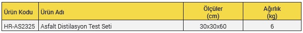 Asfalt Distilasyon (Damıtma) Test Seti, Alüminyum hazne, alev beki, stant, cam mezür, cam bağlayıcılar, yoğunlaştırıcı, 2 adet ASTM 7C, ( -2 to +300°C) termometre, CE direktiflerine uygun olarak gaz vanası ve emniyet icin alev kesici ile birlikte verilmektedir.