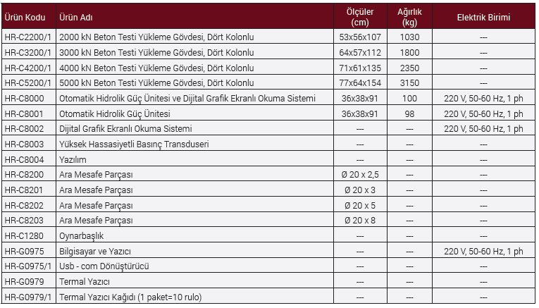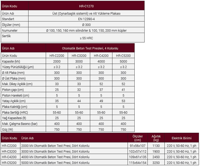 Otomatik 2000 kN, 3000 kN, 4000 kN ve 5000 kN Kapasiteli Dört Kolonlu Beton Test Presleri, çok çeşitli numunelerinin dayanımınlarının güvenilir ve tutarlı bir şekilde test edilmesi için tasarlanmıştır. Cihaz, yukarıda yazılan tüm EN, ASTM ve BS standartlarına ve aynı zamanda operatörün güvenliği ve sağlığı açısından CE normlarına da uygun olarak üretilmektedir.