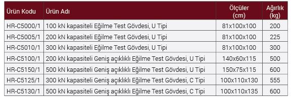 Eğilme Test Gövdelerinin 100 kN, 200 kN, 300 kN kapasiteli U Tipi, 200 kN,  500 kN kapasiteli Geniş açıklıklı U Tipi ve 300 Kn, 500 kN kapasiteli C Tipi olarak farklı seçenekleri mevcuttur.