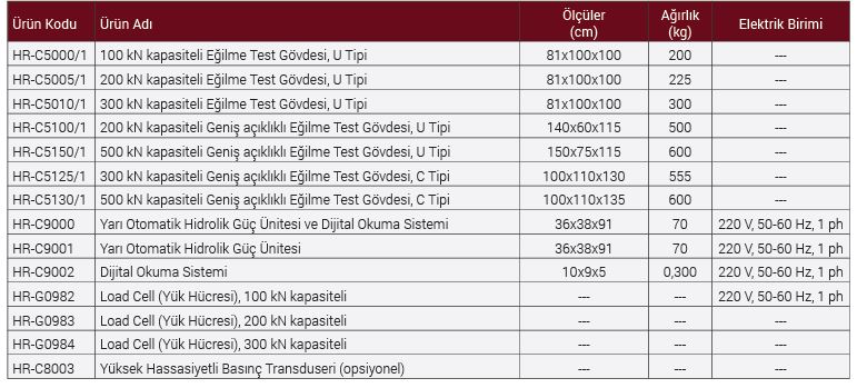 Eğilme Test Gövdelerinin U Tipi 100 kN, 200 kN, 300 kN, U Tipi Geniş açıklıklı 200 kN, 500 kN ve C Tipi Geniş açıklıklı 300 kN, 500 kN kapasiteli olarak farklı seçenekleri mevcuttur.