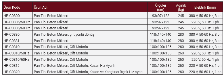 HR-C0800, HR-C0805, HR-C0810, HR-C0815 ve HR-C0820 Modellerin toplam hacmi 100 litre olup Karıştırma kapasitesi 56 litredir ve lastik tekerleklerle donatılmıştır.