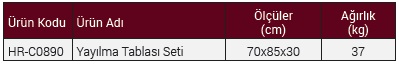 Yayılma Tablası Seti, iki adet tabladan oluşmaktadır. Üst tabla 700x700 mm ölçülerinde ve bir taraftan Alt tablaya menteşelidir. Üst tablanın metal yüzeyinde, 210 mm çaplı daire şekilli bir çizgi ve 2 adet birbirine dik merkezleme çizgileri bulunmaktadır. Tüm parçalar korozyona karşı korumalıdır. Paslanmaz çelik koninin üst kısmı ∅ 130 mm, tabanı ∅ 200 mm, yüksekliği 200 mm ve et kalınlığı 1.5 mm’dir. Ahşap Sıkıştırma Tokmağı 40x40x200 mm ölçülerinde ve tutamacı 120 mm'dir.