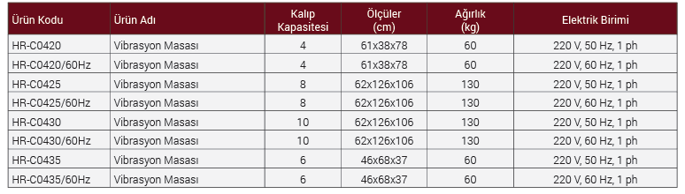 Tüm Vibrasyon masaları vibrasyon motoru, komut ünitesi ve sıkıştırma aparatından oluşmaktadır.