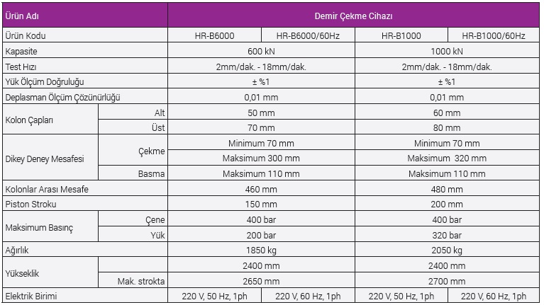 Universal Hidrolik Demir Çekme Test Cihazı (600/1000 kN kapasiteli), demir malzemeleri akma dayanımı ve çekme dayanımı gibi yapısal değerlerini test etmek için tasarlanmıştır. Çekme testlerinin yanı sıra Universal Test Cihazları, cihazın kapasitesine kadar basma testleri ve 8-20 mm çaplarda betonarme donatı çeliklerinin Bükme testleri için de kullanılabilmektedir. Basma testlerini yapabilmek için Oynarbaşlık ve Bükme testlerini yapabilmek için Bükme Aparatı ve mandreller ayrıca sipariş edilmelidir.