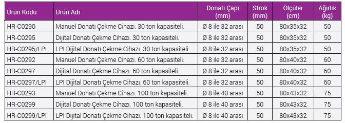 Manuel Donatı Çekme Cihazları Hidrolik Kriko (Piston), 700 bar Hidrolik El Pompası, Yüksek Basınç Hortumu ve Bağlantı aparatları ile birlikte verilmektedir.