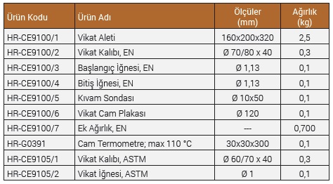 ASTM Test seti bir Vikat Aleti, ASTM Vikat Kalıbı, ASTM Vikat İğnesi, Kıvam Sondası, Vikat Cam Plakası ve Cam Termometreden oluşmaktadır.