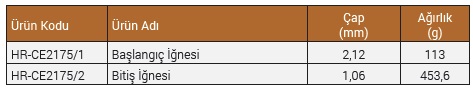 Başlangıç İğnesi Ø 2,12 mm ve ağırlığı 113 g, Bitiş İğnesi Ø 1,06 mm ve ağırlığı 453,6 g’dır.