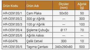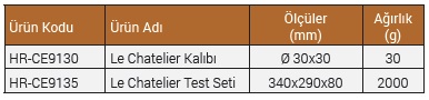 Le Chatelier Test Seti 3 adet Le Chatelier Kalıbı, 6 adfet 50x50 mm Cam Plaka, 300 gr Ağırlık, 3 adet 100 gr Ağırlık, 70 gr Şişleme Çubuğu, Çelik Cetvel ve Taşıma Çantasından oluşmaktadır.