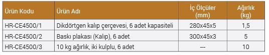 Enine Deformasyon Jig Seti EN12004'e uygun numuneler için 6 adet kapasiteli Dikdörtgen kalıp çerçevesi (iç ölçüler 280 x 45 mm, 5 mm kalınlık (Şablon A)), EN 12004'e uygun numuneler için 6 adet Baskı plakası (Kalıp) (ölçüler 300mm x 45 x 3 mm kalınlık (Şablon B)) , EN12004'e göre numunenin hazırlanması için 6 adet iki kulplu 10 kg ağırlıktan oluşmaktadır.