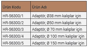 Ø 38 mm, Ø 50 mm ve Ø 70 mm Adaptörler (halka ve şişleme çubuğu) ayrıca sipariş edilmelidir.
