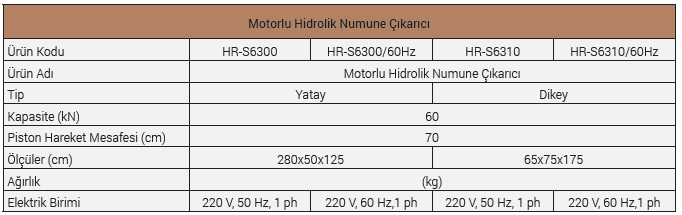 Numune Çıkarıcı 60 kN kapasiteye ve 70 cm Piston hareket mesafesine hareketine sahiptir.