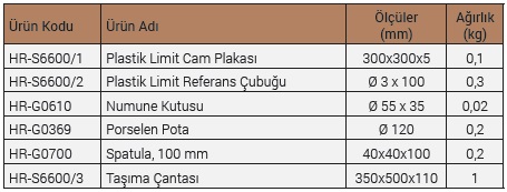 6 adet Ø 55 x 35 mm Numune kutusu, 300x300x5 mm Plastik Limit Cam Plakası, Ø 12 cm Porselen Pota, Ø 3 x 100 mm Referans Çubuğu, 100 mm Spatula ve Taşıma Çantası ile birlikte verilmektedir.
