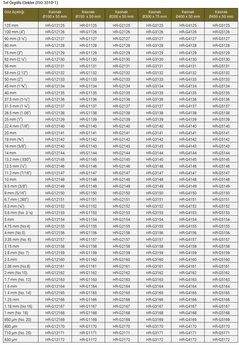 Tel Örgü Elekler; 100, 150, 200, 300, 400 ve 450 mm kasnak çaplarında, paslanmaz çelikten imal edilmiştir.