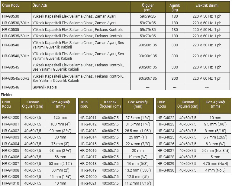 İstek üzerine farklı boyutlarda elekler imal edilebilmektedir.