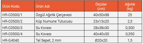 Özgül Ağırlık Testi Seti, Özgül Ağırlık Çerçevesi, Tel Sepet, Küp Numune Tutucusu ve Su Kovası ile birlikte verilmektedir.