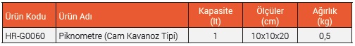 Piknometre, Maksimum 10 mm büyüklüğündeki agregalar için bağıl yoğunluk ve su emiliminin belirlenmesi için kullanılmaktadır. Cam Kavanoz Tipi Piknometre camdan üretilmiştir. Metal bir konik kapak ile birlikte verilmektedir.