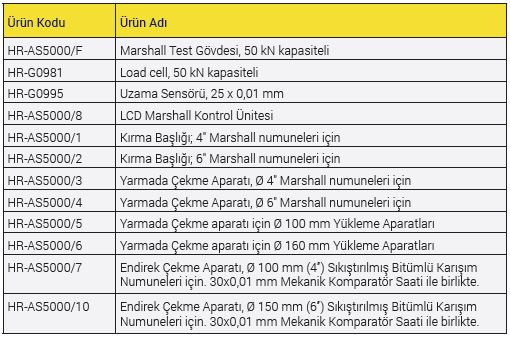 Ø 6" Marshall numuneleri için Kırma Başlığı (Stabilite Kalıbı), Ø 4" Marshall numuneleri için Yarmada Çekme Aparatı, Ø 6" Marshall numuneleri için Yarmada Çekme Aparatı, Yarmada Çekme aparatı için Ø 100 mm Yükleme Aparatları, Yarmada Çekme aparatı için Ø 160 mm Yükleme Aparatları, 30x0,01 mm Mekanik Komparatör Saatli Ø 100 mm (4”) & Ø 150 mm (6”) numuneler için Endirek Çekme Aparatı ayrıca sipariş edilmelidir.