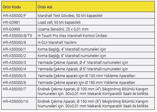 Ø 6" Marshall numuneleri için Kırma Başlığı (Stabilite Kalıbı), Ø 4" Marshall numuneleri için Yarmada Çekme Aparatı, Ø 6" Marshall numuneleri için Yarmada Çekme Aparatı, Yarmada Çekme aparatı için Ø 100 mm Yükleme Aparatları, Yarmada Çekme aparatı için Ø 160 mm Yükleme Aparatları, 30x0,01 mm Mekanik Komparatör Saatli Ø 100 mm (4”) & Ø 150 mm (6”) numuneler için Endirek Çekme Aparatı ayrıca sipariş edilmelidir.