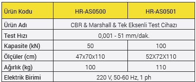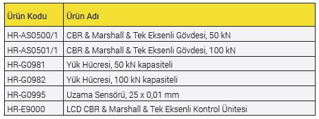 LCD CBR & Marshall & Tek Eksenli Kontrol Ünitesi, gövde kapasitesine bağlı olarak 50 kN yada 100 kN kapasiteli Yük Hücresi, 25 x 0.01 mm Uzama Sensörü ile birlikte verilmektedir.