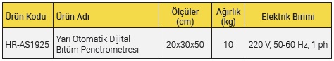 Bitüm Penetrometresi; kaba ve ince yükseklik ayar özellikli taşıma kolu, dijital iğne batma derinliği göstergesi, Otomatik penetrasyon (batma zamanı ayarlama) zamanlama ünitesi, standartlara uygun penetrasyon iğnesi, taşıma kabı ve 6 adet Ø 55x35 mm Numune Kutusu ile birlikte verilmektedir.