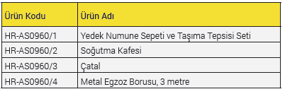 Güvenlik kapaklı 1 adet Taşıma Tepsisi monte edilmiş 2 adet Numune sepeti, tepsiyi tutmak için bir çatal ve 3 metre metal egzoz borusu ile birlikte verilmektedir.