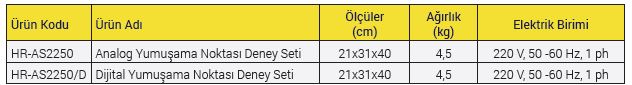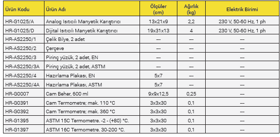Analog Yumuşama Noktası Deney Seti; Analog Isıtıcılı Manyetik Karıştırıcı, 2 adet Çelik Bilya, Çerçeve (termometre ve yüzük tutucu, Bilye Merkezleme Aparatı ve alt plakadan oluşmaktadır.), 2 adet Pirinç Yüzük (ASTM yada EN), 600 ml Cam Beher ve max. 110 °C Cam Termometre ile birlikte verilmektedir.