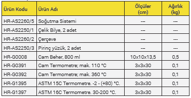 2 adet çelik bilye, Çerçeve (termometre ve yüzük tutucu, Bilye Merkezleme Aparatı ve alt plakadan oluşmaktadır.), 2 adet pirinç yüzük ve 800 ml cam beher birlikte verilmektedir.