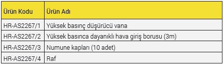 1 adet yüksek basınç düşürücü vana, 1 adet yüksek basınca dayanıklı hava giriş borusu (3 m), ekipmanı basınçlı hava silindirine bağlamak ve hava kaynağının giriş basıncını ayarlamak için kullanılır. Numune kapları (10 adet) ve raf ile birlikte teslim edilir.