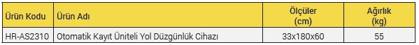 3 metre uzunluğundaki Otomatik Kayıt Üniteli Yol Düzgünlük Cihazı, hem beton hem de bitümlü yol yüzeylerindeki düzensizlikleri kontrol etmek için kullanılmaktadır. Bir tekerleğe bağlı algılama aygıtından gelen veri, skalada 4 : 1 oranında büyütülmüş olarak görülebilmektedir.