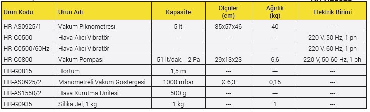 2 adet 5 lt Paslanmaz Çelik Vakum Piknometresi, Hava-Alıcı Vibratör, Vakum Pompası, Hortum, Manometreli Vakum Göstergesi ve Hava Kurutma Ünitesi (Su tutucu) ile birlikte verilmektedir.