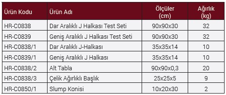 Geniş Aralıklı J Halkası Test Seti, Geniş Aralıklı J halkası, Slump Konisi ve Alt Tabla ile birlikte verilmektedir.