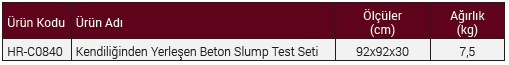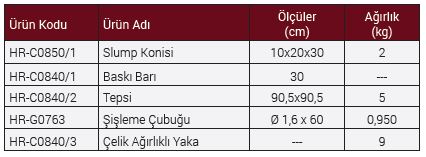 Test Seti, Çelik Slump Konisi, Baskı Barı, Şişleme Çubuğu ve 36” çaplı Tepsi, ile birlikte verilmektedir.