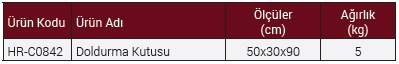 Kutu içerisinde 35 adet Pvc malzemeden üretilmiş 20 mm çapında, merkezden merkeze 50 mm uzaklığında engeller bulunur. Kutunun üst tarafında malzeme doldurmak için, 100mm çapında, 500mm yüksekliğinde doldurma borusu vardır. Boru üzerinde 100 mm yüksekliğinde huni bulunmaktadır.