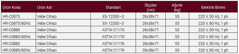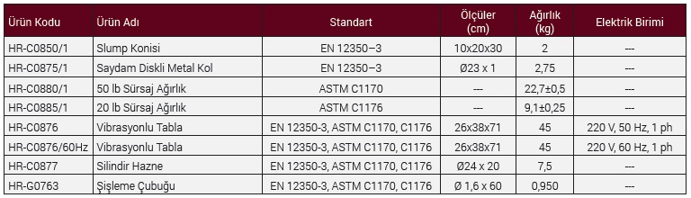 HR-C0875, Vebe süresinin belirlenmesi yoluyla Taze Beton kıvam tayini için, EN 12350-3 Standardına uygundur. Set, Vibrasyonlu Tabla, Silindir Hazne, Slump Konisi, Saydam Disk, Doldurma Hunisi ve Şişleme Çubuğundan oluşmaktadır.