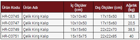 Çelik Kiriş Kalıplar, ilgili standartlarda belirtilen boyutlara ve toleranslara göre üretilmektedir. İki parçalı ve vidalı taban plakası dayanıklı ve temizlenmesi kolay olacak şekilde tasarlanmıştır.