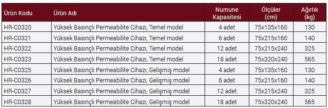 75, 100, 150, 200 mm küp numuneler, Ø100x200 mm ve Ø150x300 mm silindir numuneler test edilebilmektedir. Numuneye uygulanan maksimum basınç , 0,1 bar hassasiyetinde, 40 bar'dır.
