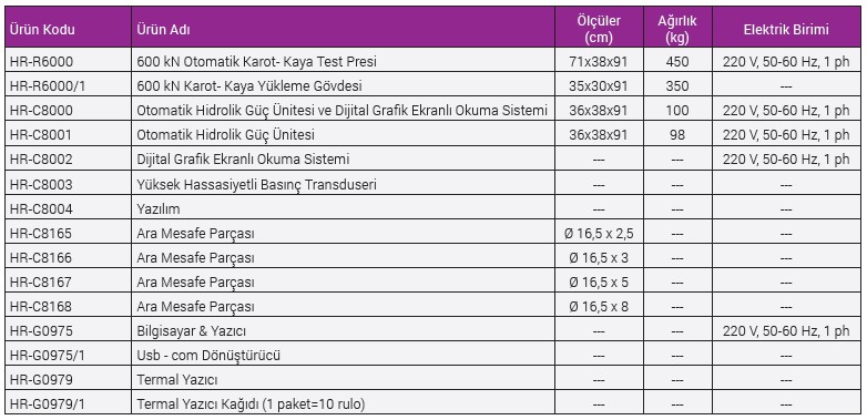 Otomatik 600 kN Kapasiteli Karot-Kaya Test Presi, karot ve kaya numunelerinin dayanımınlarının güvenilir ve tutarlı bir şekilde test edilmesi için tasarlanmıştır. Cihaz, yukarıda yazılan tüm EN, ASTM ve BS standartlarına ve aynı zamanda operatörün güvenliği ve sağlığı açısından CE normlarına da uygun olarak üretilmektedir.