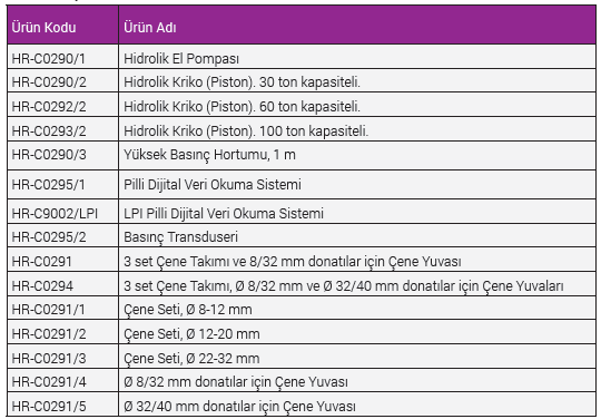 HR-C0295, HR-C0297 ve HR-C0299 Modeller; Pilli Dijital Okuma Ünitesi, Basınç Transduseri, Hidrolik Kriko (Piston), 700 bar Hidrolik El Pompası, Yüksek Basınç Hortumu ve Bağlantı aparatları ile birlikte verilmektedir.