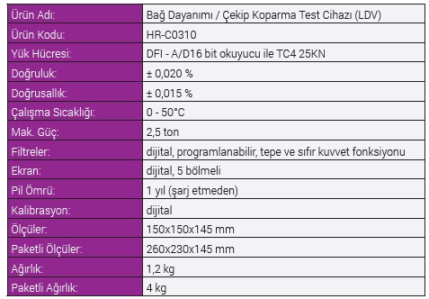 LDV Bağ Dayanımı/Çekip Koparma Test Cihazı, Kontrast Desteği, Yük Hücresi (25 o 50 kN) ve Çıkarılabilir Ekran Sistemi, Ayarlanabilir Bilyalı Çekme Kolları, Destek Uzantıları, Çekme Plakası D50, Kalibrasyon Raporu, Kullanım Kılavuzu ve Sert Taşıma Çantası ile birlikte verilmektedir.