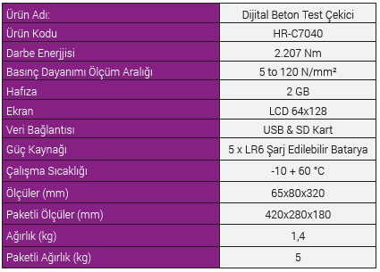 Dijital Beton Test Çekici, Aşındırma Taşı ve Kutusu, Plastik Izgara 30x30 cm, Kalem, 100 ml Fenolftalein, Not Kağıdı, Kullanım Kılavuzu, Kalibrasyon Raporu, SD Kart, Şarjedilebilir Batarya ve Taşıma Çantası ile birlikte verilmektedir.