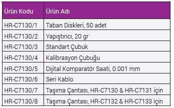 Tüm modeller için Dijital komparatör saatli boy değişimi ölçer, standart çubuk, kalibrasyon çubuğu, 50 adet taban diski, yapıştırıcı ve taşıma çantası standart olarak verilmektedir.