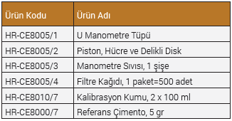 U Manometre Tüpü, Paslanmaz Çelik Hücre, Delikli Disk Delikli ve Piston, 1 şişe Manometre Sıvısı ve 500 adet Filtre Kağıdı ile birlikte verilmektedir.