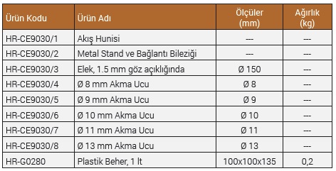 Akış Hunisi Seti, Huni, Metal Stand ve Bağlantı Bileziği, Ø150 mm, 1,5 mm göz açıklıklı Elek, 1 lt Plastik Beher ve Ø10 mm Akma Ucu ile birlikte verilmektedir.