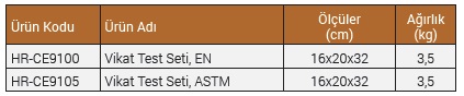 ASTM Test seti bir Vikat Aleti, ASTM Vikat Kalıbı, ASTM Vikat İğnesi, Kıvam Sondası, Vikat Cam Plakası ve Cam Termometreden oluşmaktadır.