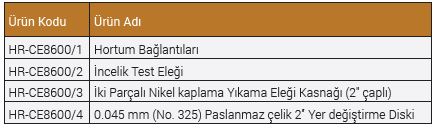 Hortum Bağlantıları, İncelik Test Eleği, İki Parçalı Nikel kaplama Yıkama Eleği Kasnağı (2" çaplı) ve 0.045 mm (No. 325) paslanmaz çelik 2" Yer değiştirme Diski ayrıca sipariş edilmelidir.