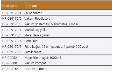 Su Tutma Aparatı; stand, su aspiratörü, vakum regülatörü, vakum göstergesi, üç yollu musluk, metal delikli çanak, cam huni, lastik conta, filtre kağıdı ve erlenmayer ile birlikte set olarak verilmektedir.