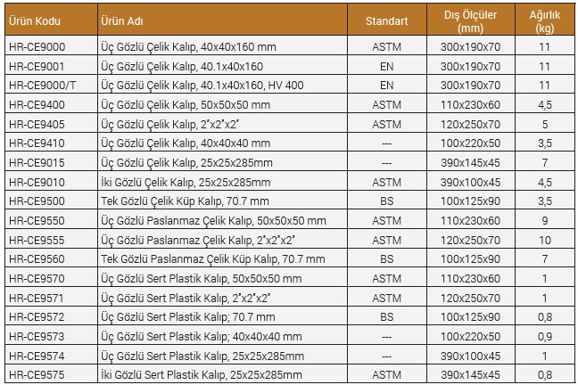 Kalıplar aşağıda belirtilen ölçülerde sertleştirilmiş çelik, paslanmaz çelik veya sert plastikten imal edilmiştir.