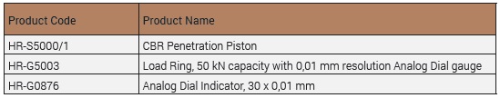 0,01 mm Analog Komparatör Saatli 50 kN Yük Halkası, 30 x 0.01 mm Analog Komparatör Saati ve CBR Penetrasyon Pistonu ile birlikte verilmektedir.
